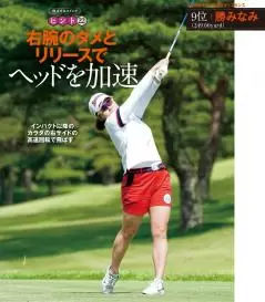 勝みなみのスイングは、インパクト以降のカラダの右サイドの回転がとても速いのが特長です。カラダの回転スピードでボールをしっかりつかまえて飛ばすタイプです。トップで深い捻転を作り、ダウンスイングで右腕をたわませてタメを生んでいます。そしてボールを打ち抜いていく瞬間、カラダの右サイドの回転と連動して右腕を一気に伸ばす。このリリースのタイミングが秀逸です。