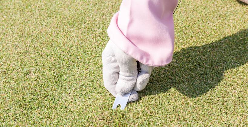 自分のプレーによってコースにつけた傷は、自分で修復するのがゴルファーとしてのマナーです。グリーンに付いたピッチマークはグリーンフォークを使って直しましょう。