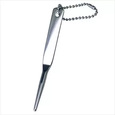| 特徴 | カラビナ付きでベルトループやバッグに装着可能なグリーンフォーク。メタルTの抜き型のマーカー付き。 |