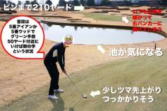 編集K 次は、普段池を嫌って右に打ち出しちゃう池越えの2打目地点です。ピンまでは210ヤードくらい、グリーンには200ヤード飛ばせれば乗せられるという状況です。