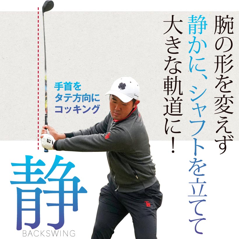 腕の形を変えず静かに、シャフトを立てて大きな軌道に!