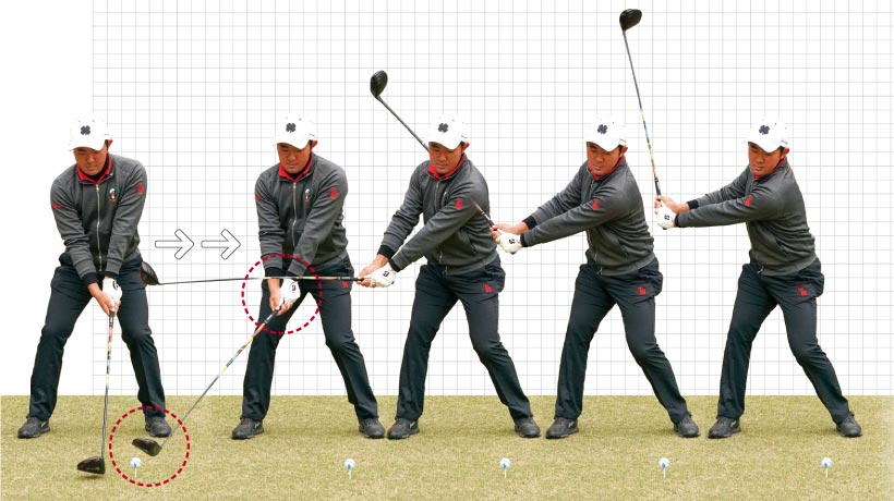 お尻を後ろに動かすと、ヘッド軌道はインサイドから入ってくるので、つかまったボールが打てます。アウトサイドからヘッドが入る軌道でスライスに悩んでいる人は特に、金谷選手のお尻を引きながら、左足を踏む動きが参考になると思います。