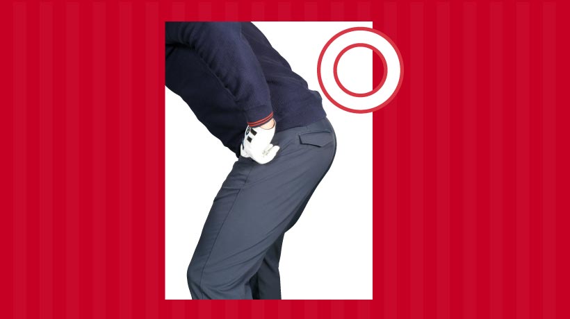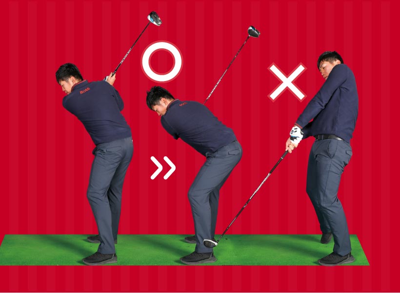 ②左ヒザは真上に伸ばしているのではなく、少し後ろ側に斜めに伸ばすことで、お尻が後ろに下がり、体が突っ込まないスイングになる。