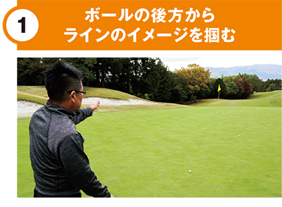 マークしてからボールの後ろから見る。後ろからラインを読むことによって、このライン全体が、どのくらいのスネークなのかという大まかなイメージをつかんでおく。