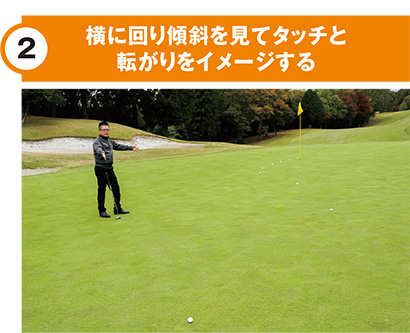 長いスネークラインの場合、最初の『ロングパットは球から離れて』、2打目の『ショートパットは球の近く』に立つ構え方をしてみよう。ロングパットは遠く立つことによって視野が広がりタッチが出しやすくなるし、ローテーションが使いやすくなるので長い距離をしっかりと打てる。ショートパットでボールの近くに立つと、腕とシャフトが一直線に並ぶので、微妙なラインも正確にヒット出来るようになる。