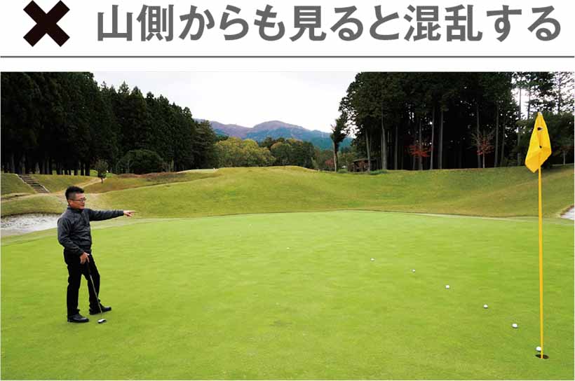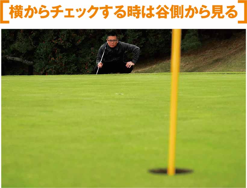 ラインを横から見る時に一番重要なのが『谷側』から見ること。低い方からラインを見ると、どこが高くてどこが低い、どこがフックかスライスかが良く分かる。