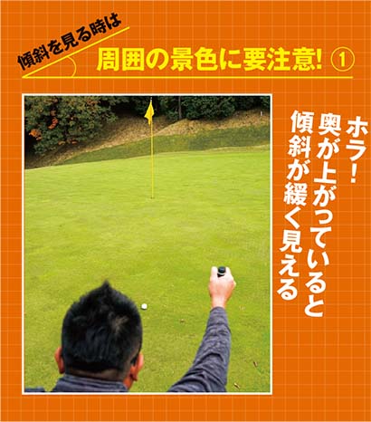 例えば、上りの傾斜をボール側から見た時に、グリーンの奥が斜面で受けていた場合は要注意だ。奥の傾斜が目に入ることで、パッティングの上りラインの度合いが薄まって、あまり上っていないように見えてしまうからだ。プロは、そういう目の錯覚に惑わされないように、手をかざして斜面を遮断して、グリーン面の傾斜だけを見てラインを判断している。