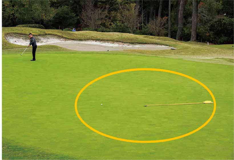 そこでこういうケースでは、ターゲット意識を変える必要があります。つまり、ターゲットをカップではなく、カップを中心にした半径3mのサークルに設定します。小さいカップを狙わずに、大きな3mのサークルに入れるように打つことで、肩の力が抜けてタッチが出しやすくなるのです。