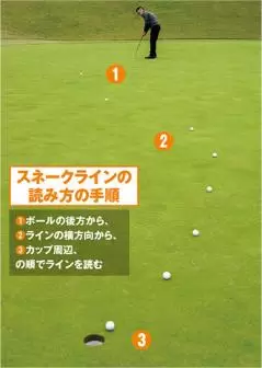 スネークラインを見る手順は、①ボールの後ろから見る。この時に、どのくらいのスネークなのかという大まかなイメージをつかみます。次に②横から見て、ボールの打ち出し直後の傾斜と、最後のカップ周りの傾斜を見ます。この時に、ボールの転がる勢いが衰えるカップ周りの傾斜を入念にチェックしておきましょう。横から見てカップインをする時の球の勢いや方向をイメージ出来たら、9割がたチェックは終了。最後にボールの後ろから再びラインをチェックして打っていきます。
