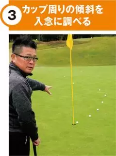 ボールの転がりの勢いが衰えたカップ周りが最も傾斜の影響を受けることになるので、カップ周りは入念にチェックすること。