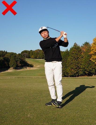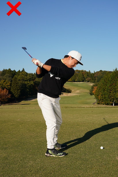 ×前傾姿勢が強すぎるとクラブがアウトサイドに上がりやすくなる。