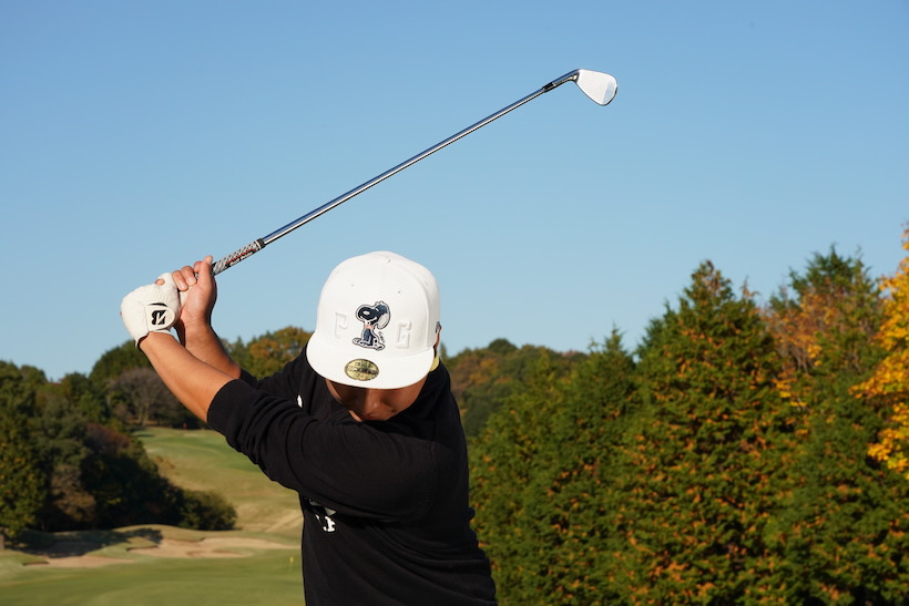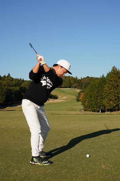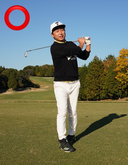 フィニッシュをかっこよく決めるためのチェックポイントはもう一つあります。それはトップオブスイングです。スイングは左右対称の楕円軌道なので、フィニッシュが決まっている人はトップもかっこいいし、トップが決まっている人はフィニッシュもかっこよく収まっています。