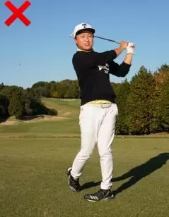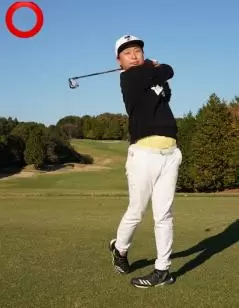 ○右足から左足へ体重をしっかり移すことが大事。打ったあと飛球線方向に歩き出すくらい大げさでもいい。