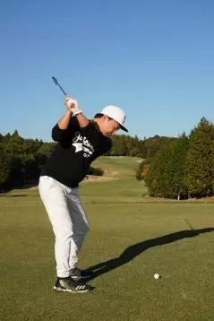 手の位置は耳の後ろ、シャフトが飛球線と平行になるのが理想。ただし個人差があるので無理して真似る必要はない。