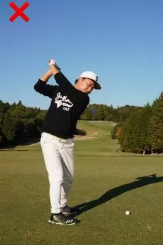 とくに初心者が気をつけたいのはトップでシャフトが飛球線より右をさすシャフトクロスや平行よりもヘッドが下がるオーバースイングです。ダウンスイングで手元が浮いてトップしたり、シャフトが寝て下りてダフったりしやすく、またどちらもスライスやシャンクの原因になり、それを避けるためにひっかけも出やすくなります。シャフトが飛球線と平行に上がるトップが理想ですが、個人差があるので無理矢理矯正するのではなく、できるだけ近づけるというくらいに考えた方がいいでしょう。