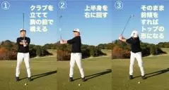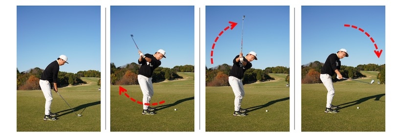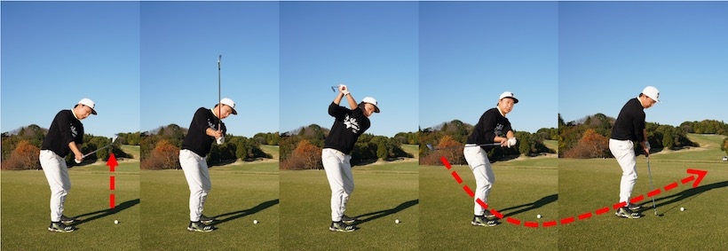○クラブを体と一緒に回せば自然に内側に上がる