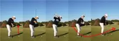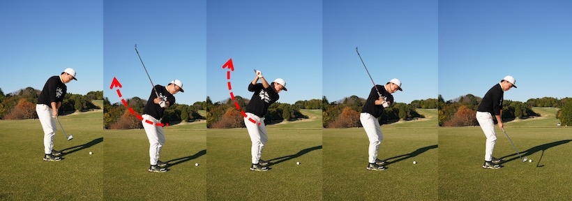 手がだんだん体から離れていくはずです。そしてダウンスイングでは反動でヘッドが下に落ちてインサイドからフェースが開いたまま入りやすいのでボールは右に飛ぶようになってしまいます。