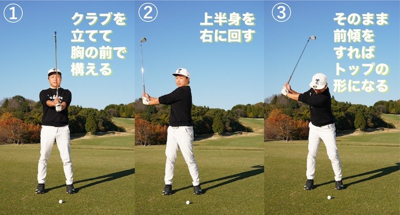 正しいスイング軌道にクラブをのせるためには、後ろにまっすぐ引いても、内側にまっすぐ引いてもいけません。正解は「まっすぐ」ではなく「丸く動かす」です。クラブを体の正面に置いて、体の回転を使って丸く動かす意識を持つことで体とクラブの距離が常に一定に保たれ、きれいなスイング軌道を描くことができます。