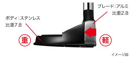 異素材(ブレード、ボディ)の比重差を活かした深重心・高慣性モーメントヘッド設計。