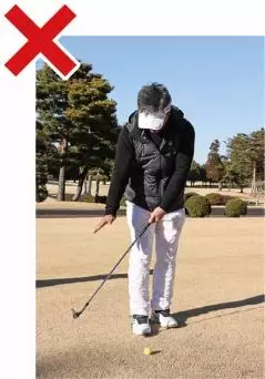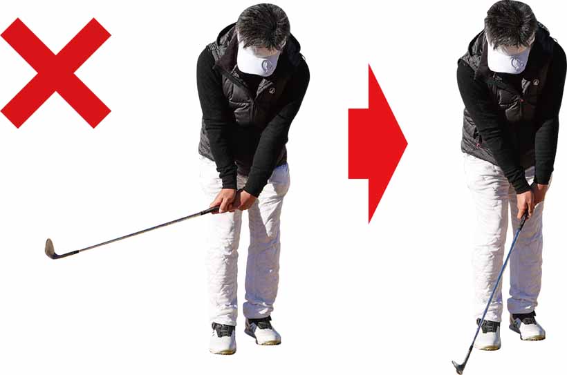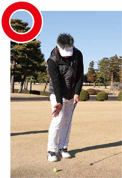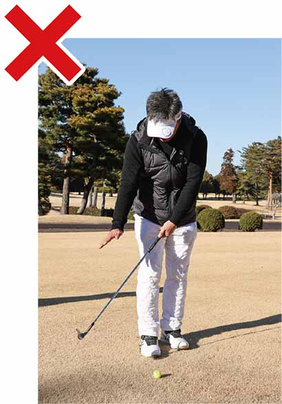 ザックリでショートしたり、逆にトップして球が強く出てオーバーさせてしまったり。アプローチで大きなミスが出るときはたいてい上からボールを突っつくような打ち方になっています。特に芝の薄い冬はボールに直接ヘッドを当てようとしてクラブがどんどん上から入っていくようになります。もちろんそういう打ち方が必要な局面もありますが、そればかりしているうちにやわらかい球が打てなくなる弊害も出てきます。
