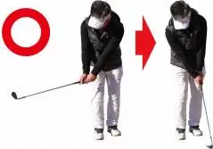 写真左)フェースを閉じて使わないようにテークバックで意識的にフェースを開く。