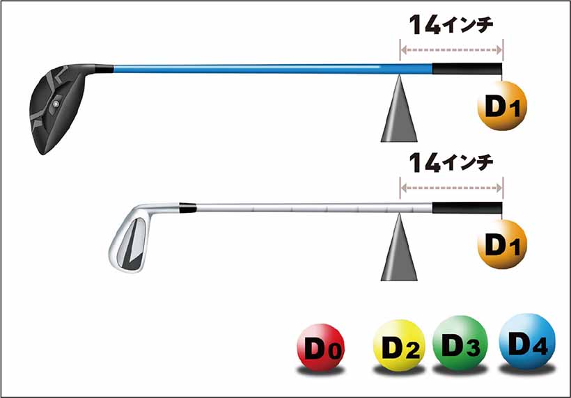 さて、現在ではドライバー、FW、UT、アイアン、ウェッジすべてに同モデル同重量のシャフトを装着していることは少ない。となれば、ヘッドタイプごとの同一シャフトでのみ、バランスをそろえるのが妥当だろう。