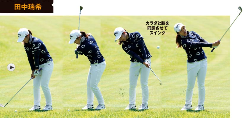 「アプローチショットは手打ち」と思ったら、それは間違いです。三ヶ島かな選手と田中瑞希選手のスイングを参考にしてください。腕をカラダの近くで振っていますよね。これがアプローチの肝で、腕とクラブをカラダの正面にキープしたまま、胸を左右に回すだけのシンプルな動きが理想のスイング。手打ちになると腕がカラダから離れてしまいます。