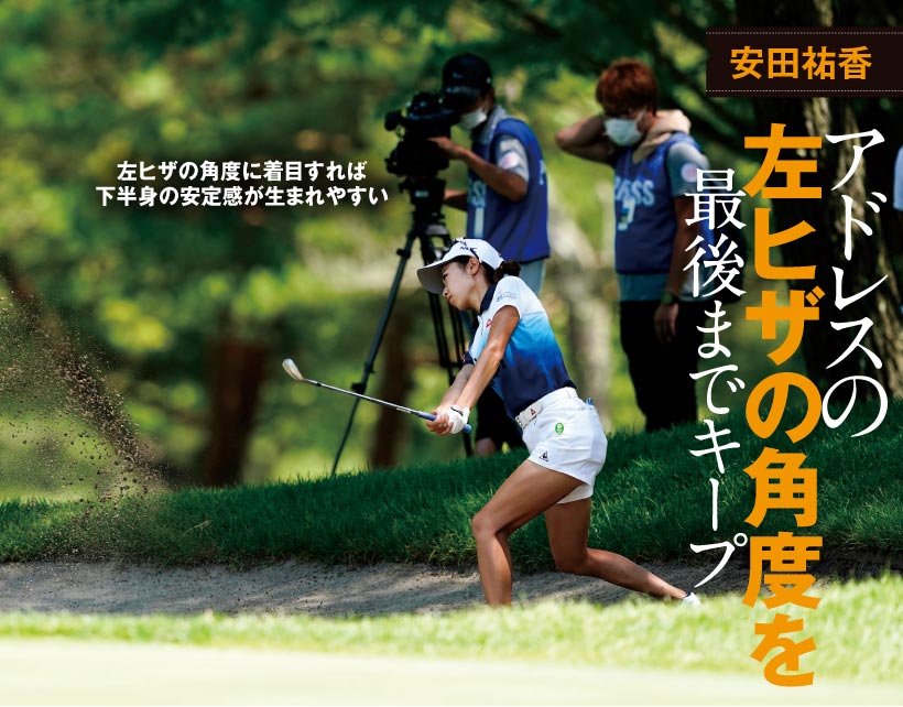 安田祐香選手の軽い左足下がりのバンカーショットです。ボールが上がりにくくて、アマチュアゴルファーにとっては脱出に苦労させられる場面でしょう。