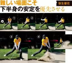 左足がバンカー内、右足はバンカーの外で状況的には左足下がりですが、難度はさらにアップします。こんなとき多くのアマチュアは何とかうまく当てようとして腕を硬く使ってしまい、下半身が緩みやすいのです。
