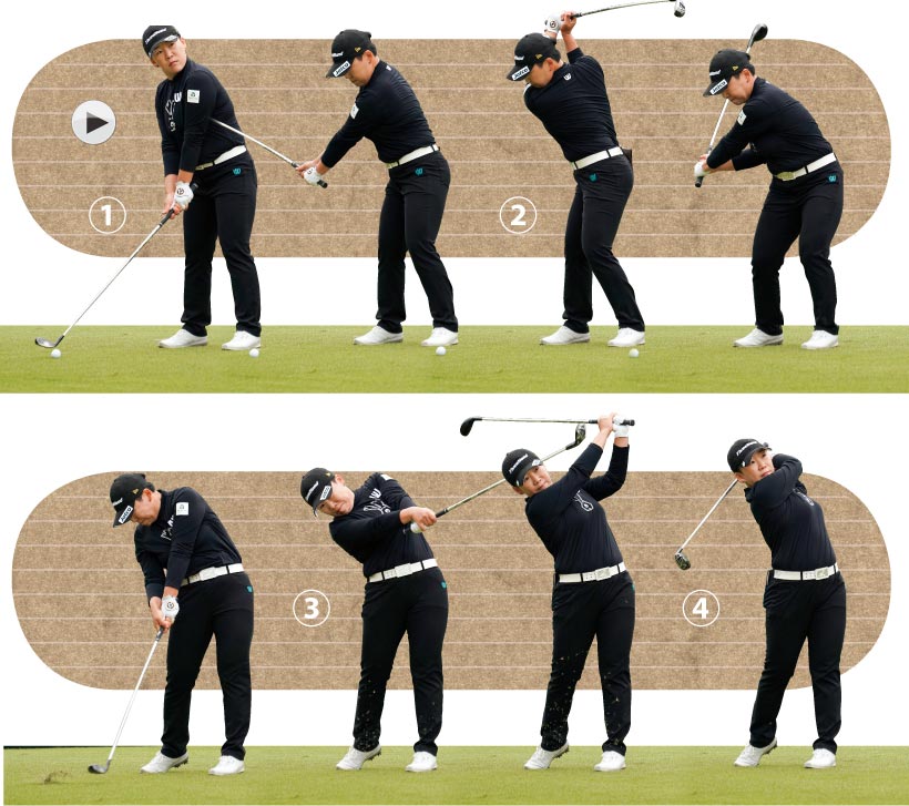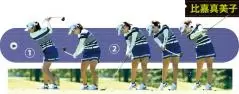 比嘉真美子選手はどっしりした下半身が上体の回転を支えているという印象のスイングです。トップの捻転の深さや捻転を一気にほどいてパワーの効率を上げています。