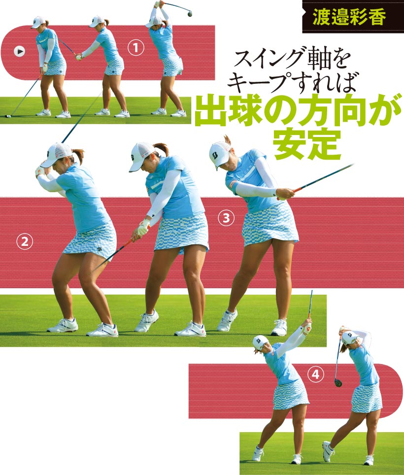 ドライバーと同様、高いトップからクラブをタテに振り下ろしてフェードを打つのが渡邉彩香選手のスイング。安定したフェードが打てるのは軸を一定にキープしているから。