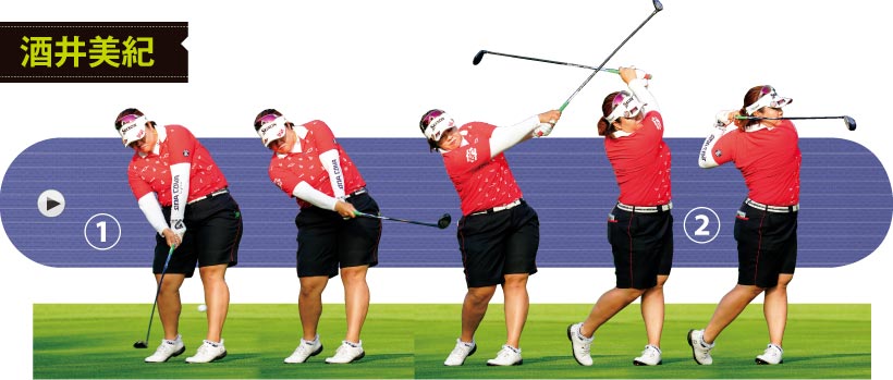 一方の酒井美紀選手のスイングはカラダを素直に回して、スムーズに振り抜いているという感じです。