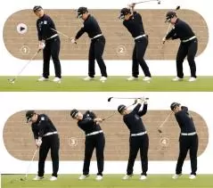 見た目にはスイングのタイプが違っていても、基本的なポイントは一緒です。アドレスの両肩と両腕の三角形をできるだけ崩さずに、カラダの回転を主体にスイングする。カラダをしっかり回すには、クラブを目標よりも左へと振り抜く。これが大事です。クラブを目標に向かって真っすぐ出そうとすると、フォロースルーで腕がカラダから離れて、カラダの回転にブレーキがかかってしまいます。