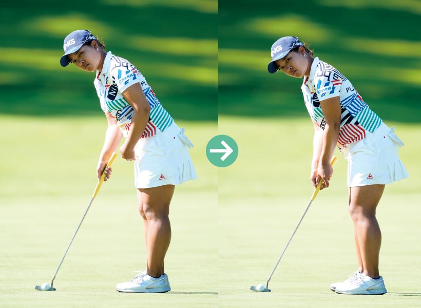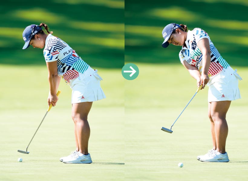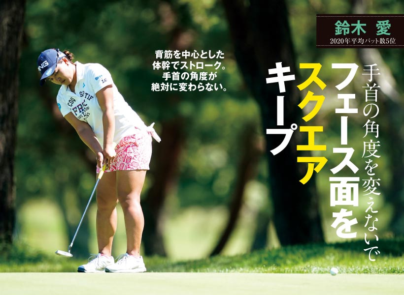 鈴木愛選手のパットは女子ツアーでトップレベルです。アドレスの肩、腕、手、パターの位置関係をしっかりキープしてストロークしています。アドレスを作り、ボールを打ち終えるまでのルーティンもつねに一定で、パットをとても丁寧に打っているところも素晴らしいです。