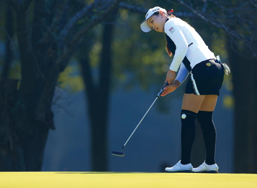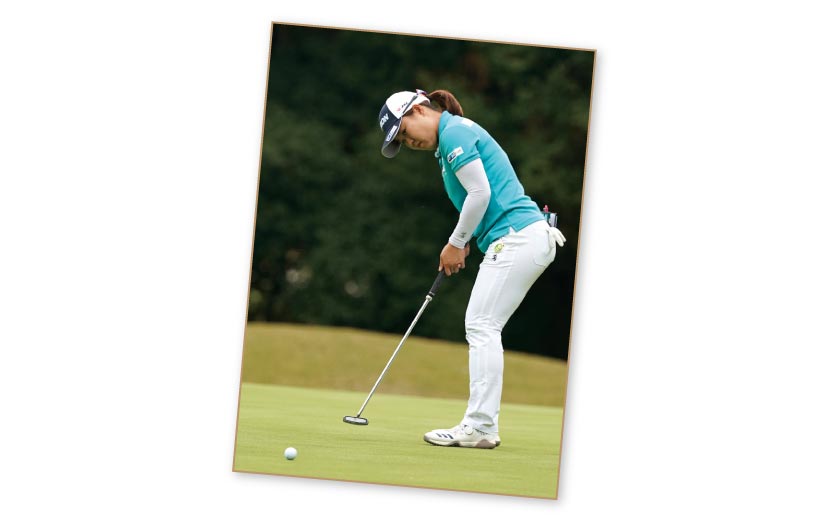 1ラウンドの平均パット数が28・1892、パーオンしたホールの平均パットも1・756で2位というデータが示すように、勝みなみ選手はパットがすごく上手い選手です。一番の長所は両ヒジを軽く曲げて構え、両肩と両腕の五角形をまったく崩さずに、インパクト以降でヘッドを加速させるようにストロークしていること。