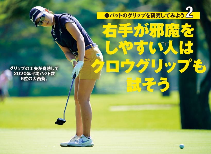 どうしてもカップに入れたいときって、右手が邪魔をすることが多い。そこで利き手の右手をクロウグリップに握り、右手の無駄な動きを封じるというわけです。大西葵選手のように左手をクロウグリップにする人もいますが、要は何らかの反動を起こさせないでストローク軌道の正確性を高めるのが目的です。形にとらわれずに、自分にとってベストのスタイルを見つけ出しましょう。