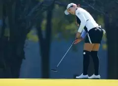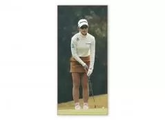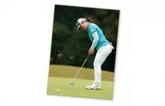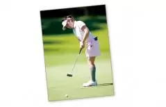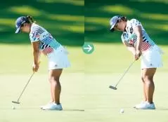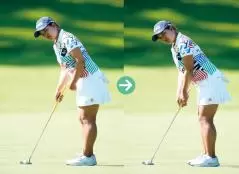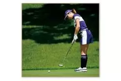 柏原明日架選手のパットはストロークのテンポがいいですね。注目して頂きたいのはインパクト後の目線。打った後も首の角度を変えないで、ボールの転がりを目で追っています。結果を早く見ようとして目線がボールの先にいくと、首が早く起きてしまいます。ストロークの軌道を狂わせる元凶ですから、目線の取り方にも注意しましょう。
