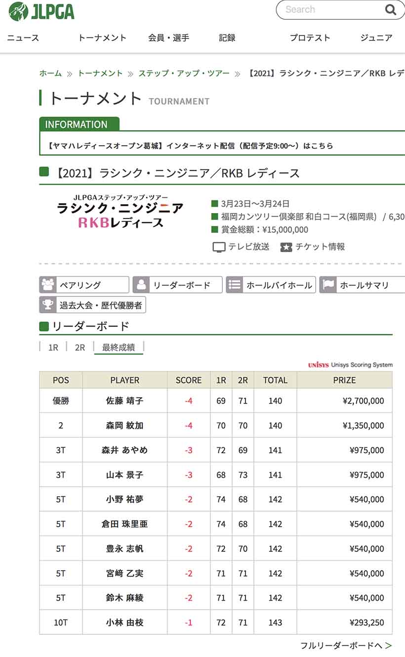今年、全国で最も早く桜の満開が発表されたのは福岡市(福岡管区気象台)だった。3月22日午前中のことである。満開発表から2日後の3月24日、その福岡市にある福岡カンツリー倶楽部和白コースで行われたラシンク・ニンジニア/RKBレディースで長い雌伏の時を経て満開の花を咲かせたのが佐藤だ。