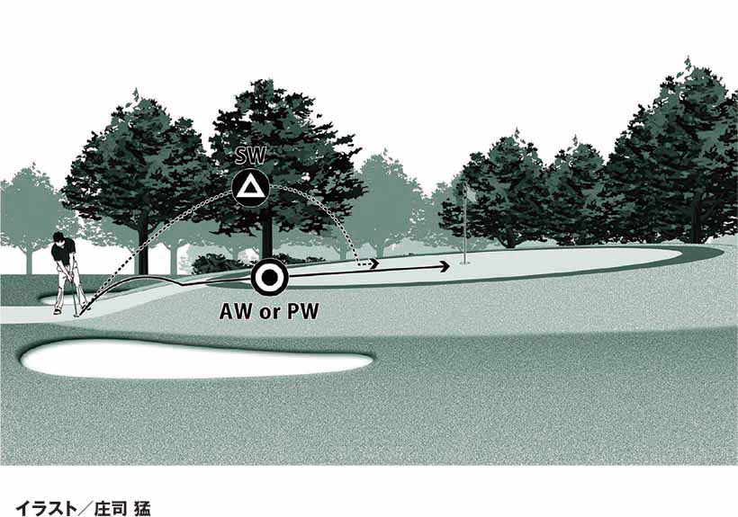 日本のコースの大半は砲台グリーンですから、花道からはやや左足上がりとなります。傾斜を無視してボールを上げようとするのがミスの原因ですけれど、ちゃんと打てたとしても「あれ、全然届かないや?」という現象が起こりやすいので注意が必要です。ロフト角58度のSWを持つとすれば、花道上で構えるとロフト角が65度近くに増えます。ボールが高く上がりすぎてキャリーが少なくなり、手前にショートしやすい。つまりスイングのミスではなくて、クラブ選択のミスです。SWをAWに持ち替えるだけで十分対応できますし、ピンが奥めでピッチエンドラン、もしくはランニングアプローチで寄せたければPWを使いましょう。