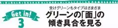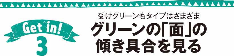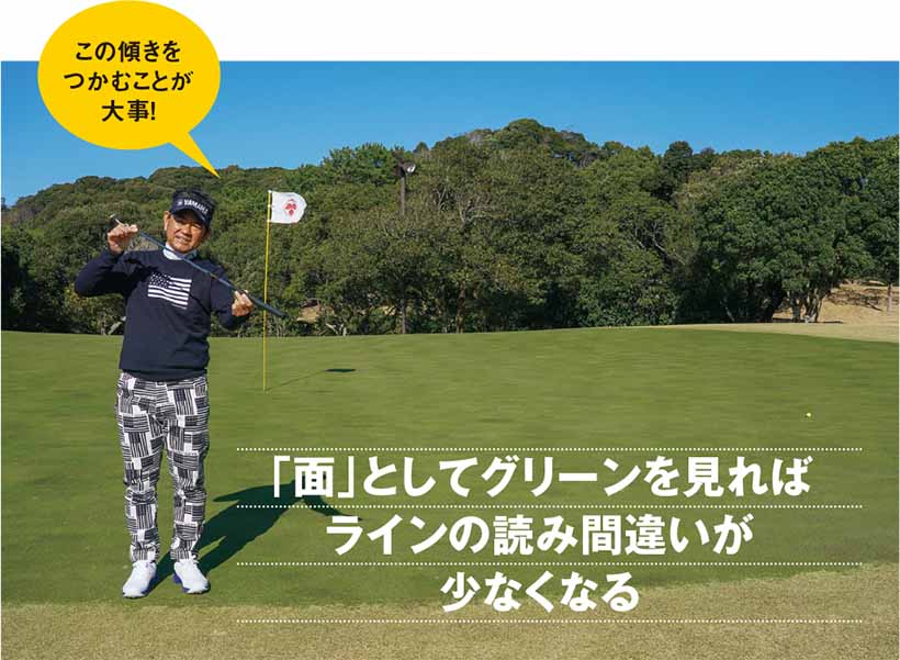 「面」の傾き具合を見れば、全体的なボールの曲がり方が予想でき、ラインの読み間違いが少なくなります。加えて、グリーンの速さも感じ取れるので、タッチが合う。受けグリーンでなくても、「面が奥に向かって傾いているz「面が二つに分かれている」というように、グリーン全体を「面」でとらえることが重要です。