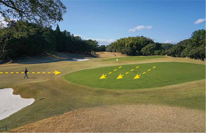 グリーンの手前が一番低く、奥が一番高ければ、いわゆる「受けグリーン」で、手前から奥に向けて上り傾斜、奥から手前に向けて下り傾斜になる。「日本のゴルフ場の7-8割はこのタイプ」と藤田プロは言います。