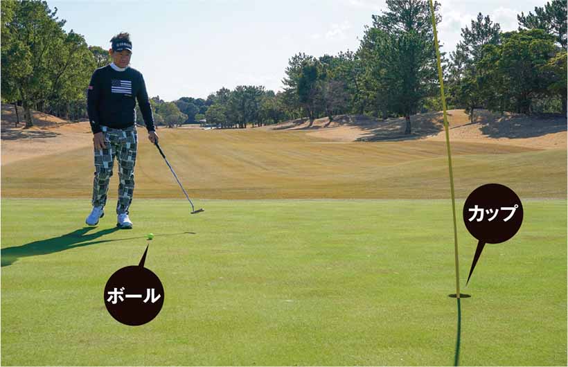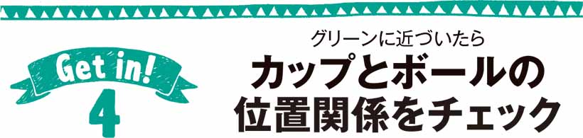 グリーンに上がる前に、もう一つやるべきことがあります。それは、カップ(ピン)とボールの位置関係をチェックすることです。カップとボールのどちらが高いのか、その高低差はどのくらいなのかをよく観察しましょう。