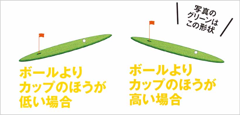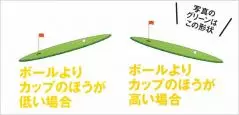 イラスト右)カップのほうが低ければ、下りのラインになり、その高低差を考慮してグリーンの速さ(スピード)を予想する。