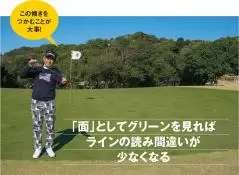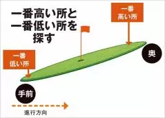 面の傾き方がわかれば、上り、下り、フック、スライスがおおまかにわかり、同時に速さ(スピード)も感じ取れる。自分のパットのラインだけにこだわりすぎて、グリーン全体の傾斜を把握しないと、「木を見て森を見ず」の状態に陥り、ラインを読み間違えてしまう。