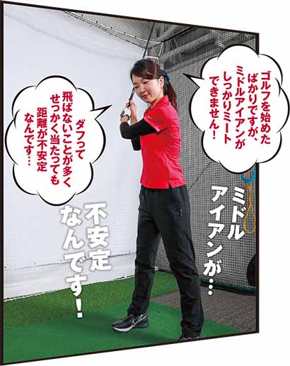 加藤さんのお悩み「ゴルフを始めたばかりですが、ミドルアイアンがしっかりミートできません! ダフって飛ばないことが多くせっかく当たっても距離が不安定なんです……」