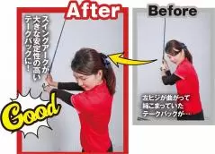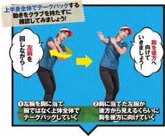 写真 右)クラブは体の近くになくても大丈夫!左ヒジを伸ばしたままテークバックしましょう!