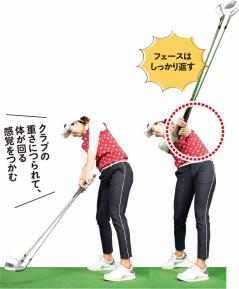 だから直前練習では、ゆっくりしたスピードで良いので、ヘッドの重さで腕が伸びた大きなスイングを作る。インパクトからフォローにかけては体は耐える感覚のまま、フォローで両腕を伸ばすことを意識してください。