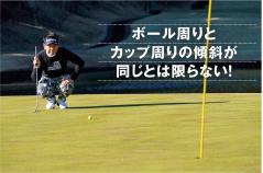 カップの反対側に回り、カップ周りの傾斜がボール周りとはどう違うのかをよく観察する。そして、カップ際のボールの曲がり方(切れ方)をイメージする。