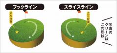 グリーンの傾斜も同じです。グリーン全体を一つの面としてとらえ、面の傾き具合をチェックしたら、傾いている面の「低い位置」からラインを読みます。つまり曲がるラインは、傾斜の上側ではなく、下側に立つことがポイント。スライスラインは右サイド、フックラインは左サイドに立てば、面全体が見やすくなり、曲がり幅を具体的にイメージできます。