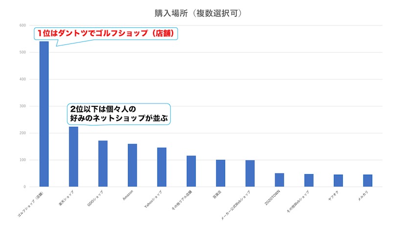 まずは「購入場所」だが、回答者662人のうち9割近い人が「ゴルフショップ(店舗)」(1位・541票)を選択。複数回答可としていたのだが、楽天ショップ(2位・224票)、GDOショップ(3位・172表)といったネットショップを選択した人は意外と少なかった。